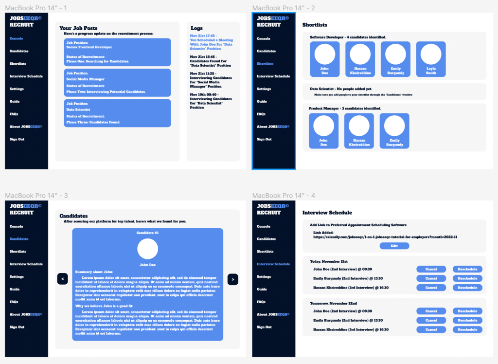My very first wireframes of JOBSEEQR Recruit, as shown in Figma. Like every idea, some elements stayed, others were eliminated, and better features were added. For instance, I remodeled the “Candidates” and “Shortlists” pages, and scrapped the “Interview Schedule” page. This was also before I sealed the partnership with Omnipresent, which explains why the “Payroll” page isn’t there.
